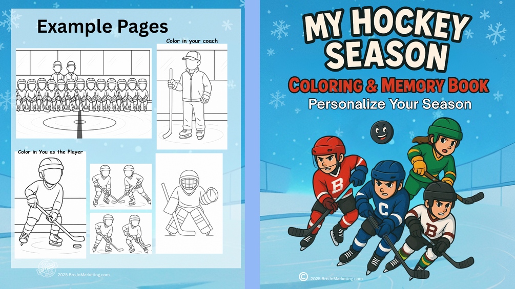 The My Hockey Season Coloring & Memory Book turns your child’s hockey season into an unforgettable keepsake. Designed for kids ages 5–12, this printable 8.5x11" PDF lets players color themselves, their teammates, and their rink — while recording scores, highlights, and favorite memories.
